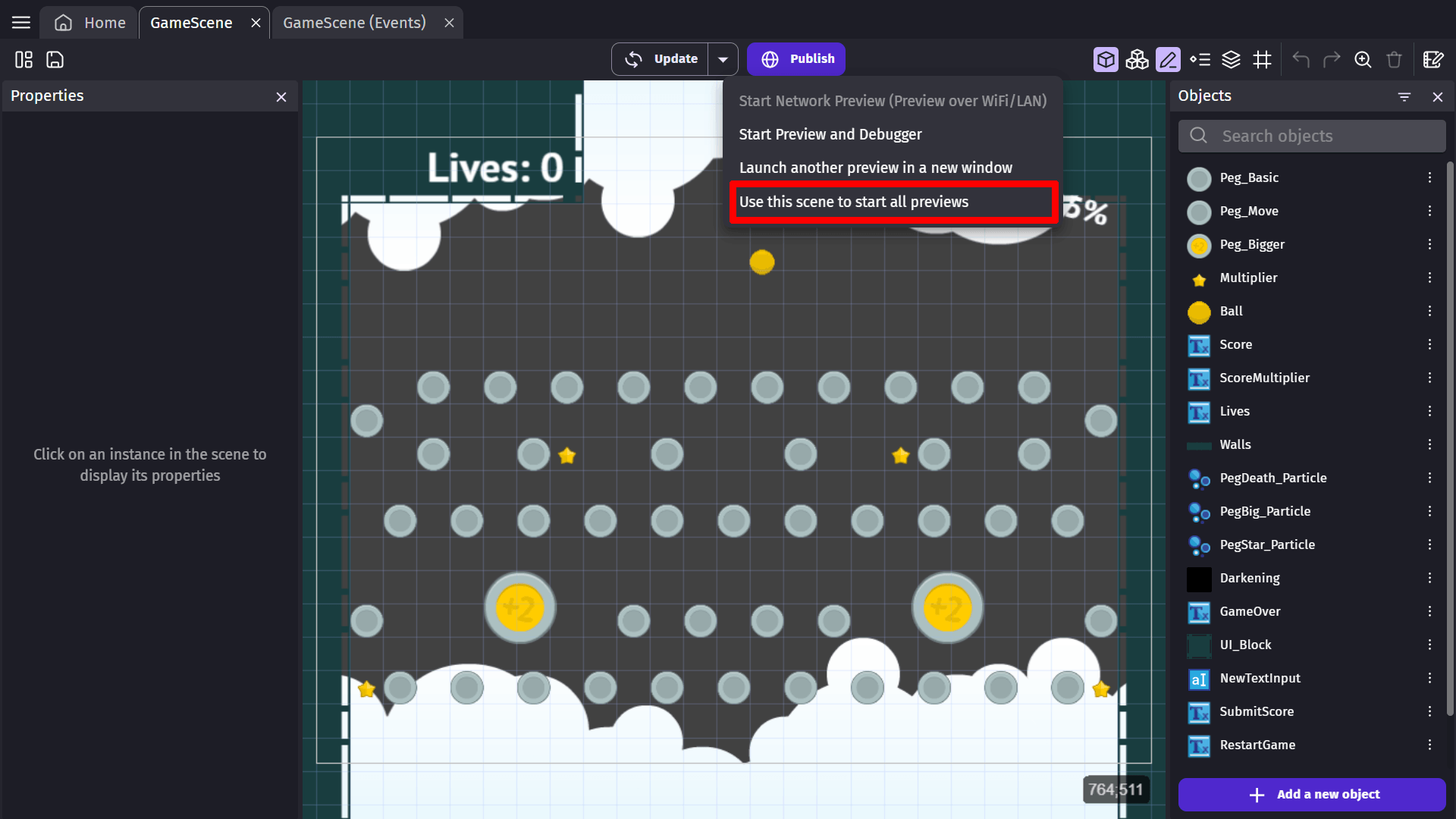 This is especially useful when you want to make tweaks to your game, like changing the parameters of effects or the properties of the behavior of an object, and see the result immediately. It's also useful to check how your events are working without restarting your preview from the beginning.
